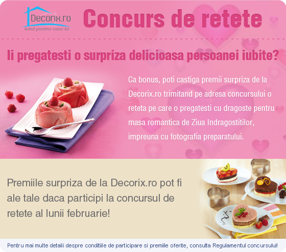 In februarie gatesti cu dragoste si Decorix.ro te premiaza!In primul rand, felicitari castigatorilor concursului de retete Decorix.ro din luna ianuarie: Beatrice Grintoiu, Veronica Cretu si Diana Kintsch si multumiri tuturor participantilor. Luna aceasta avem o noua editie cu o noua tema, la care sunt invitati toti bucatarii pasionati sau amatori, care gatesc cu dragoste si nu au mai fost premiati pana acum in cadrul acestui concurs.Daca planuiesti sa-ti suprinzi iubitul sau iubita cu un cadou delicios de Ziua indragostitilor, profita de ocazie si inscrie-te la concursul Decorix.ro din februarie! O luna in carea dragostea se cere exprimata este perfecta pentru a-i face suprize placute partenerului tau. Chiar daca dragostea nu trece prin stomac, o masa romantica pentru care gatesti chiar tu va va face sa vedeti viata putin mai roz si mai plina de savoare. In plus, reteta pregatita de tine de Ziua indragostitilor, trimisa pe adresa concursului impreuna cu fotografia preparatului, iti poate aduce numeroase premii surpriza de la Decorix.ro!Cum participi? Pregateste cu dragoste o reteta de Ziua indragostitilor, fa o poza rezultatului si trimite fotografia, impreuna cu textul retetei, pe adresa de email